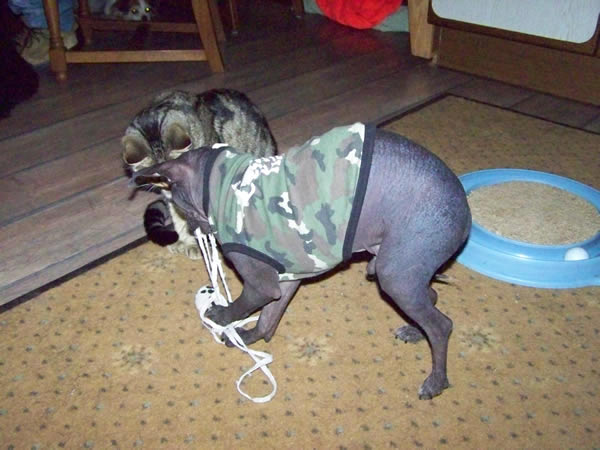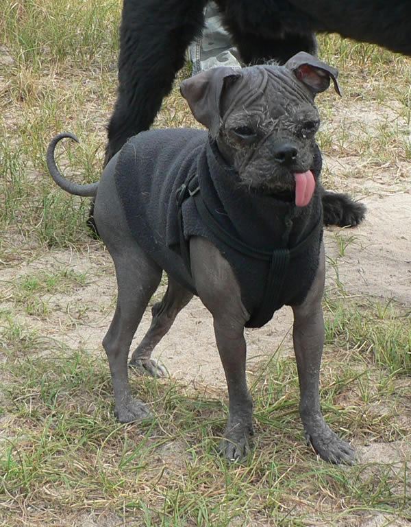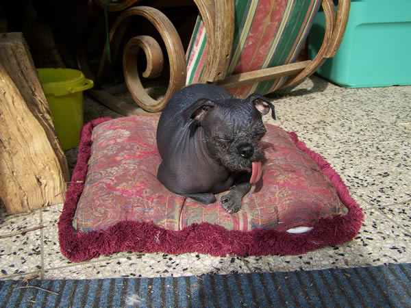 Seit dem 16. September 2009 gehört der Nackthund-Mischling Thaddäus zu unserer Familie. Er soll ca. 2 Jahre alt sein, benimmt sich derzeit aber noch wie ein Welpe. Er stammt aus einer slowakischen "Qualzucht", wo ein Vermehrer Mexikanische oder Peruanische Nackthunde mit anderen Rassen verpaarte. Vermutlich steckt in Thaddäus auch ein belgischer Griffon oder Mops, der eine kürzere Schnauze hat, und deshalb hängt seine Zunge ständig heraus. (Die Zunge ist zu lang, die Schnauze zu kurz.)
