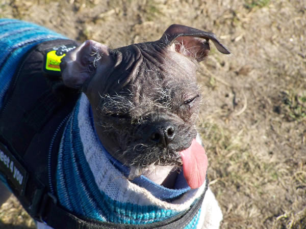 Translation: Since 16 September 2009 the Xoloitzcuiintile or Viringo mix Thaddäus is part of our family. He is supposed to be approx. 2 years old, but he still behaves like a puppy. He comes from a breeding factory where Mexican or Peruanian hairless dogs were bred with other breeds. Possibly there is a Belgian Griffon or pug in Thaddäus, who have a shorter snout. That's probably the reason why his tongue constantly hangs out. (The tongue is too long, the snout too short.)